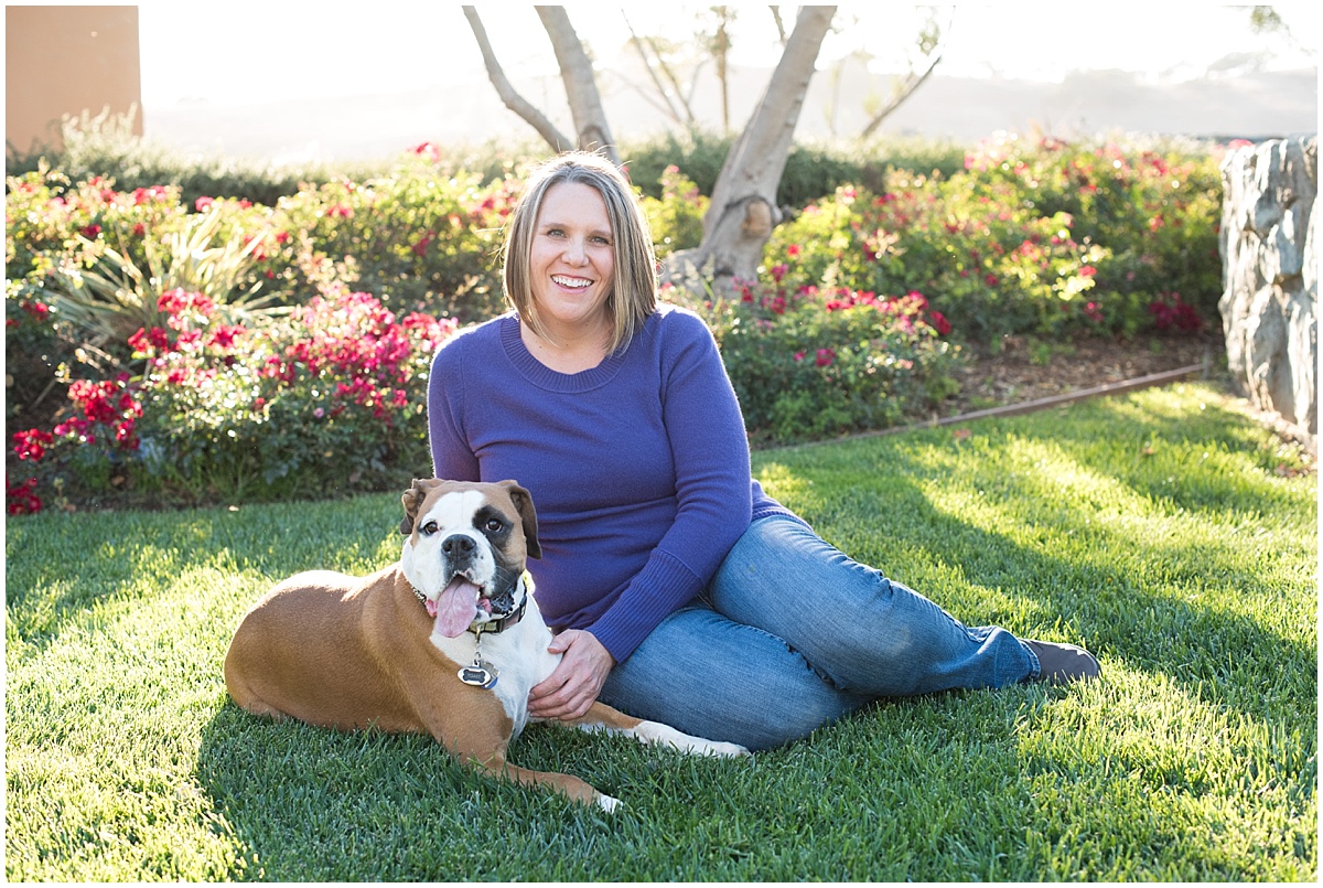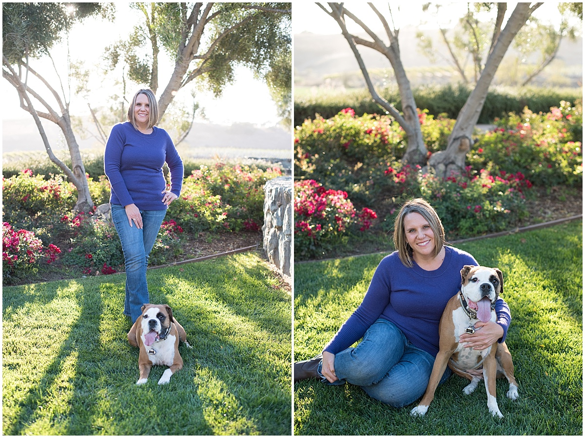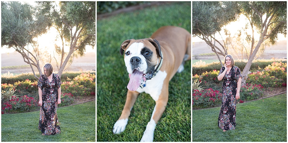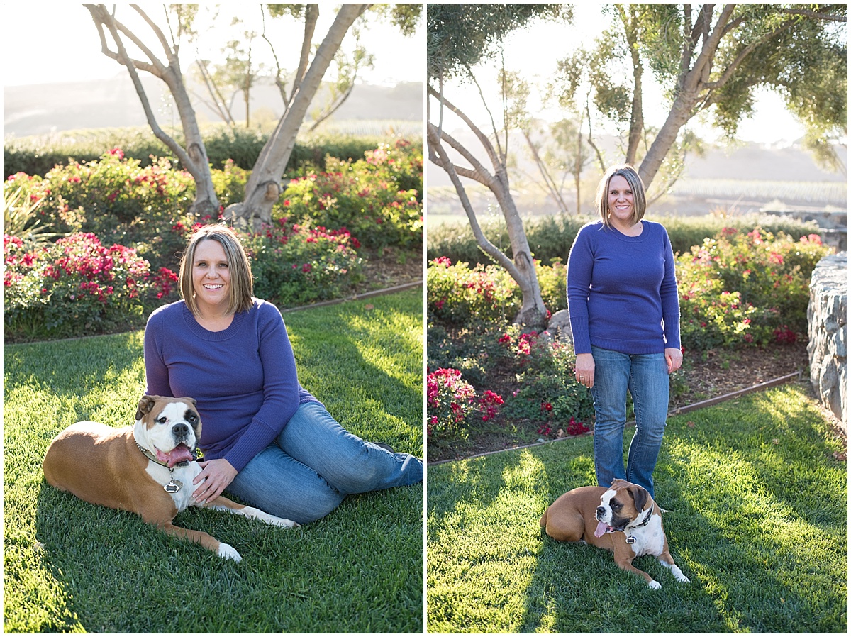Amy and I had been planning her session for months, so when the day finally came I was more than a little excited!! We had a wonderful time hanging out at Talley Vineyards in Arroyo Grande. The property really lends itself well as there is a wide variety of backdrops. You can venture through the vines, relax on their lawn, play in the pumpkin patch, or stroll down their tree-lined driveway. And on this Friday evening, the warm California sun peaked through giving such a gorgeous glow, I was on cloud nine!! Oh, and did I mention, Amy brought her sweet sweet Boxer named Toast. Toast is the sweetest and loved playing while I snapped a few photos along the way.